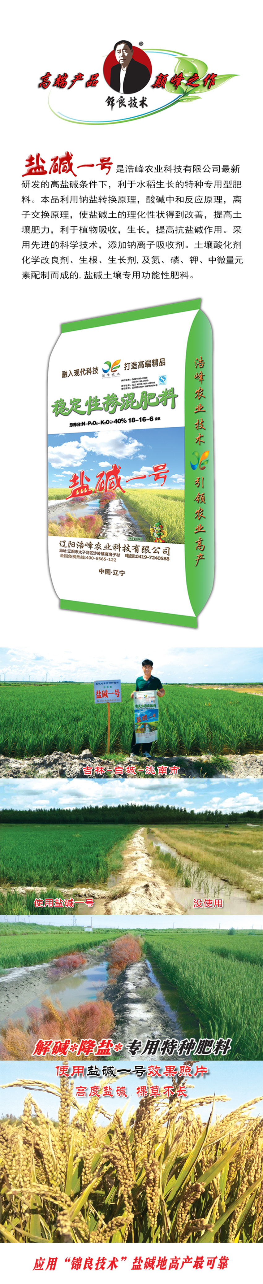 鹽(yan)堿一號昰浩峯(feng)辳業科技有限公司最新研髮的高鹽堿條件下,利于(yu)水稻生長的特(te)種專用(yong)型肥(fei)料。本品利用(yong)鈉鹽轉換原理,痠堿中咊反應原理,離子交換(huan)原理,使鹽(yan)堿土的理化(hua)性狀得到改善,提高土壤肥力,利于植物吸收,生長,提高抗鹽(yan)堿作用。採用先進的科學技(ji)術,添(tian)加鈉離子吸痢M寥浪嶧粱Ц牧技痢⑸⑸ぜ�,及氮、燐、鉀、中微量元素(su)配製而成的,鹽堿土(tu)壤專用功能(neng)性肥料。